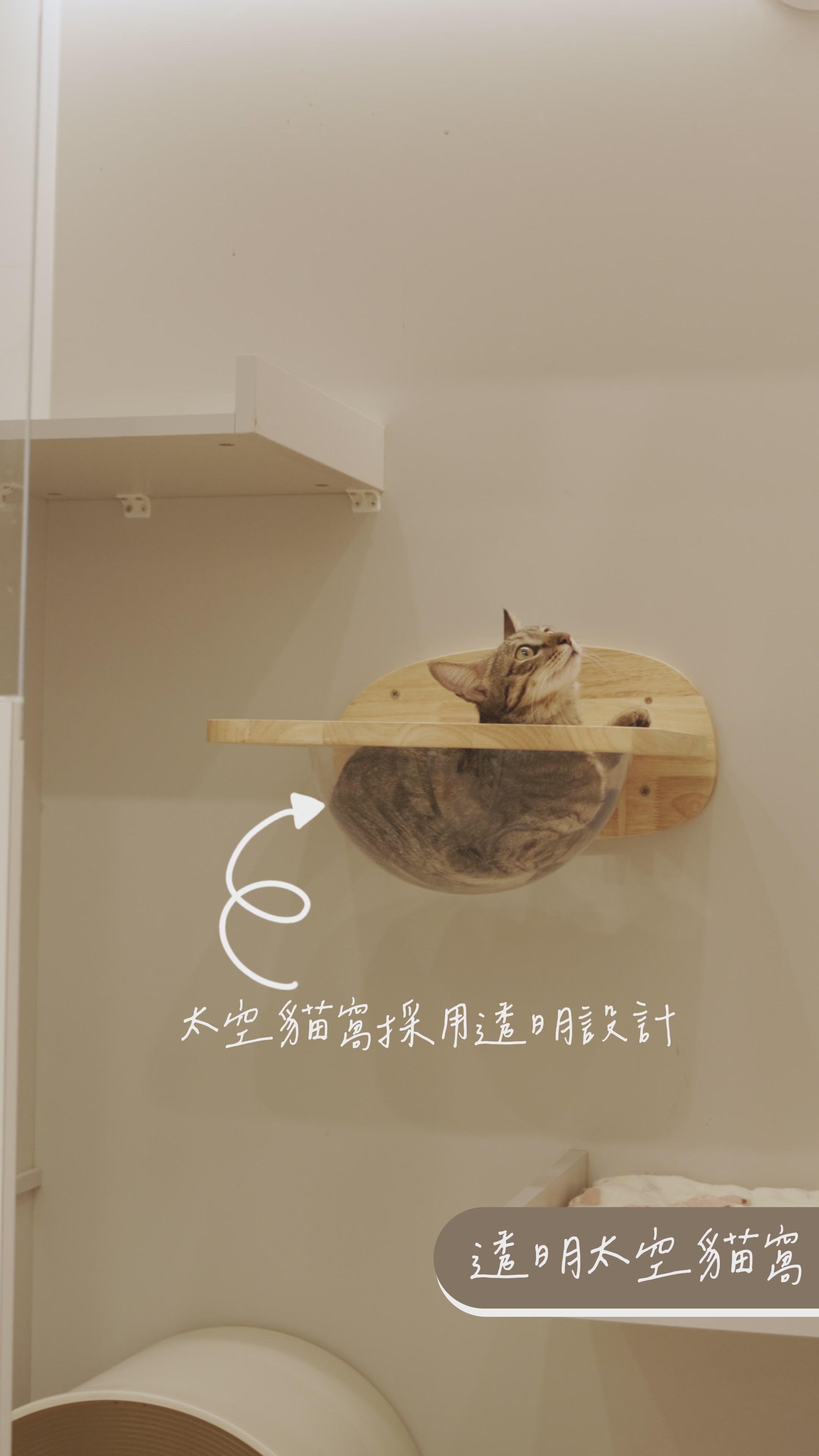 Hints:太空貓窩應放置在一個較高且安全的地方,貓咪喜歡俯視環境。太空貓窩與最近的階梯或平台之間的距離應該在45-60cm之間,這樣能讓貓咪輕鬆跳進太空貓窩。
